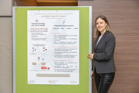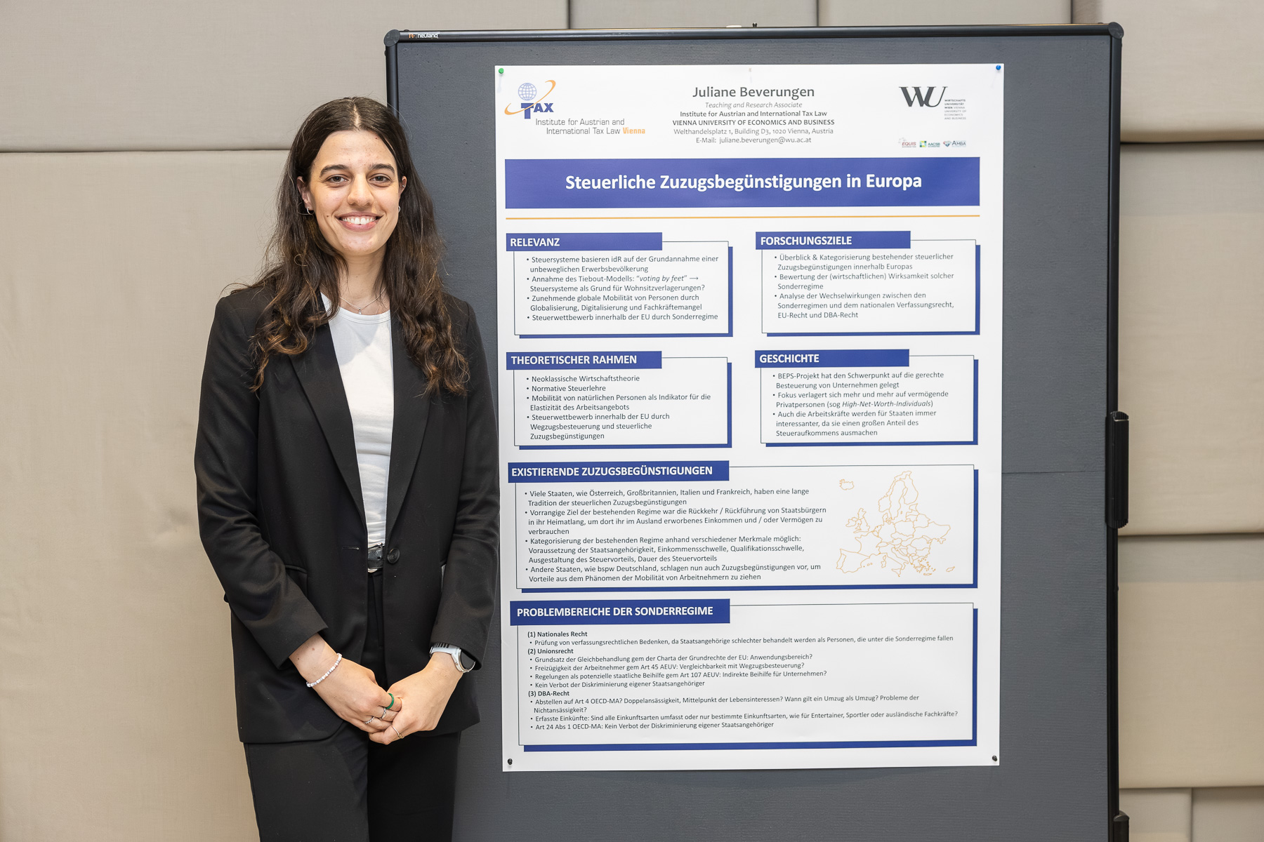 Juliane Beverungen hat an der Universität Freiburg studiert und dort ihre Bachelor in Wirtschafts- und Politikwissenschaft abgeschlossen. Während ihres Studiums arbeitete sie dort als studentische Hilfskraft am Lehrstuhl für Betriebswirtschaftliche Steuerlehre. Anschließend zog sie nach Wien, um an der WU einen Master in Steuerrecht und Rechnungslegung zu absolvieren. Während dieser Zeit arbeitete sie bei KPMG Österreich im Bereich der Unternehmensbesteuerung, danach als wissenschaftliche Mitarbeiterin am Institut für Österreichisches und Internationales Steuerrecht der WU Wien. Im Rahmen dieser Tätigkeit verfasst sie nun ihre Dissertation im Internationalen Steuerrecht.