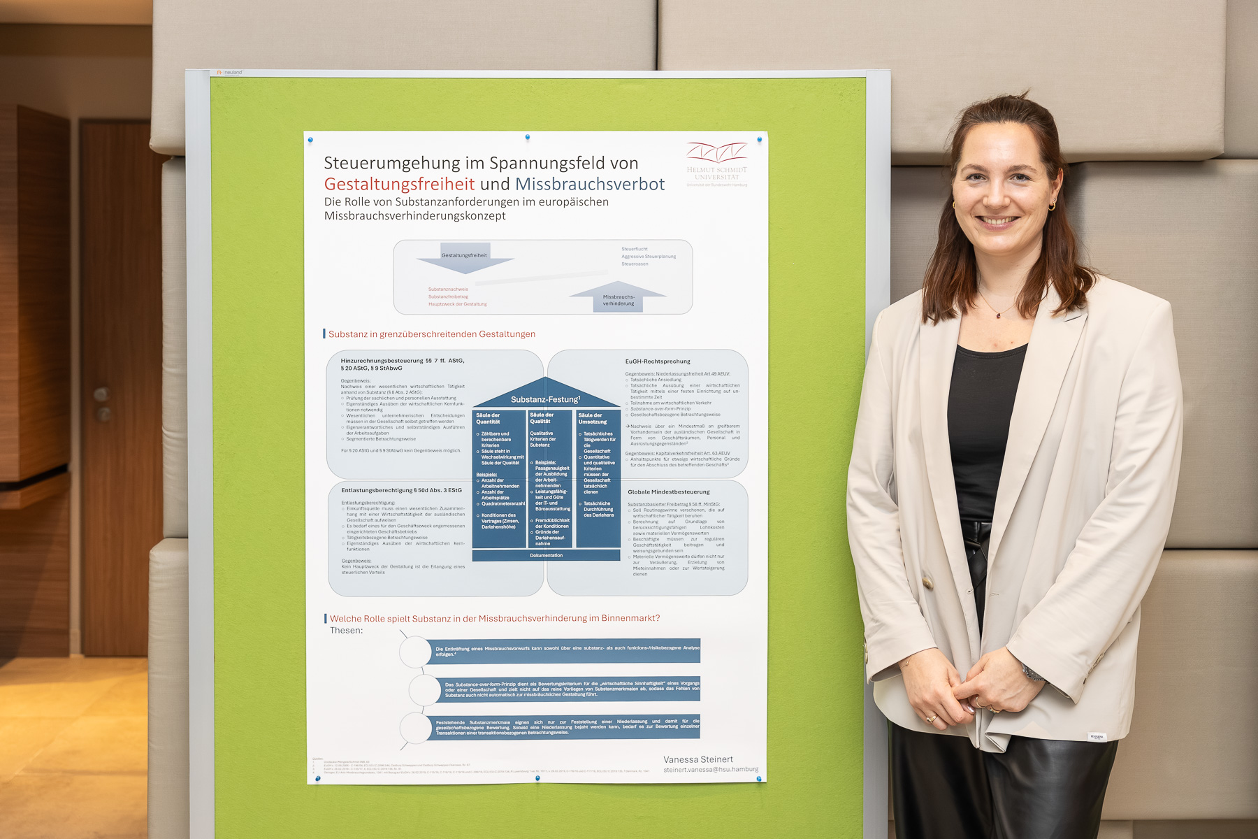 Vanessa Steinert ist wissenschaftliche Mitarbeiterin am Lehrstuhl für Öffentliches Recht und Steuerrecht an der Helmut-Schmidt-Universität. Sie promoviert zum Substanzbegriff im europäischen Recht der Missbrauchsverhinderung. Nach dem Abitur absolvierte sie eine Ausbildung zur Bankkauffrau und studierte danach im Zuge Ihrer Offiziersausbildung bei der Bundeswehr Betriebswirtschaftslehre mit dem Schwerpunkt „Accounting and Business Taxation“. Neben ihrer Tätigkeit am Lehrstuhl sammelte sie über mehrere Jahre praktische Erfahrung als Steuerassistentin in einer Steuerkanzlei.